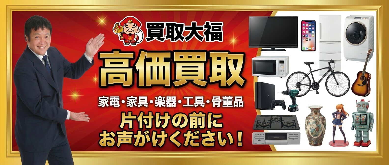 買取はもちろん、遺品整理や生前整理なども行っております。プロの目線でしっかりと査定、片づけさせていただきます。